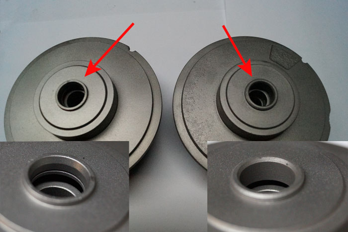 Na rysunku poniżej widzimy po lewej korpus z oryginalnym otworem na wałek z pierścionkiem uszczelniającym .Widać w nim faskę która wspiera uszczelnienie , dzięki niej mamy pewność że , wszystkie te elementy odpowiadające za uszczelnienie turbosprężarki od strony wydechowej czyli: rowek na wałku , pierścień uszczelniający oraz korpus są ze sobą spójne. Wracając do zdjęcia , po prawej widzimy korpus z tulejowanym otworem i tu nie mamy faski tylko zwykłą rurkę - zostawiamy bez komentarza .