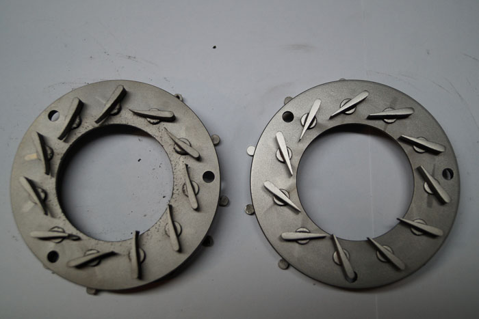 Na zdjęciach widzimy zmienne geometrie : jedna uszkodzona (ciało obce wypadające z silnika np: nagar z kolektora lub egru ) z powykrzywianym łopatkami oraz brakami na ich powierzchni obok niej geometria bez śladów zużycia w stanie nadającym się do ponownego użytku.